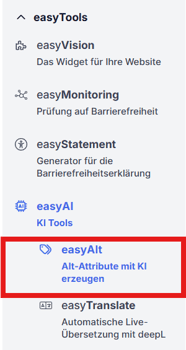 Sie können easyAlt über das linke Seitenmenü oder über die Tabs aufrufen: