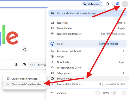 Klicken Sie in der Symbolleiste auf die drei Punkte. Im Menü wählen Sie Erweiterungen und anschließend Chrome Web Store besuchen aus.