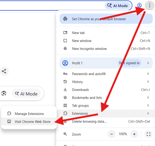 Click the three dots in the toolbar. In the menu, select Extensions and then Visit Chrome Web Store.