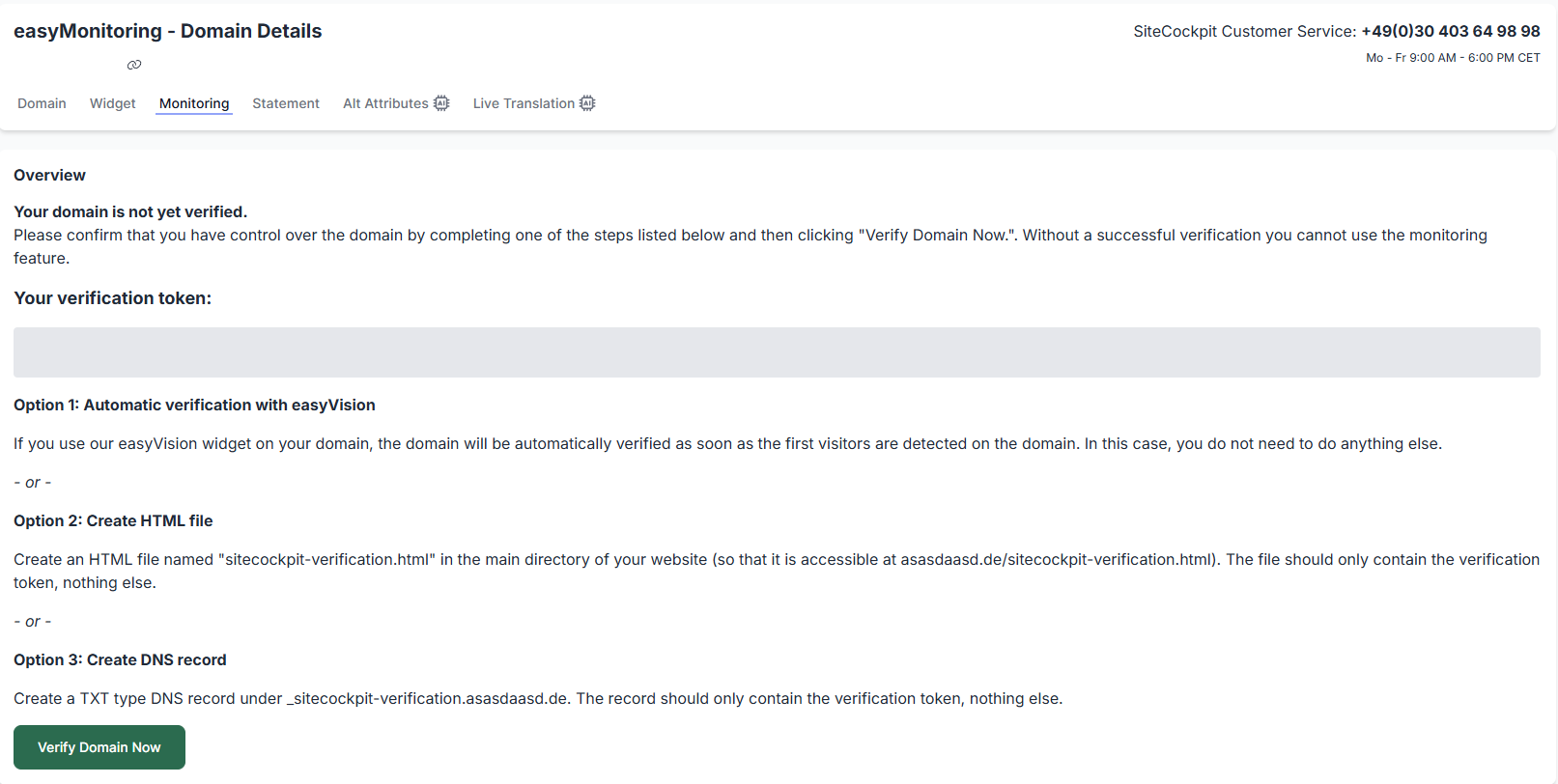 If the easyVision widget is embedded and your site has had at least one visitor, verification will occur automatically – no further action is needed.