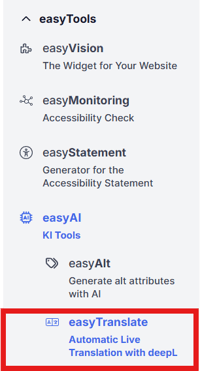 easyTranslate automatically detects text content on the website via the easyVision widget and translates it in real time. The European service provider DeepL is used for translation.